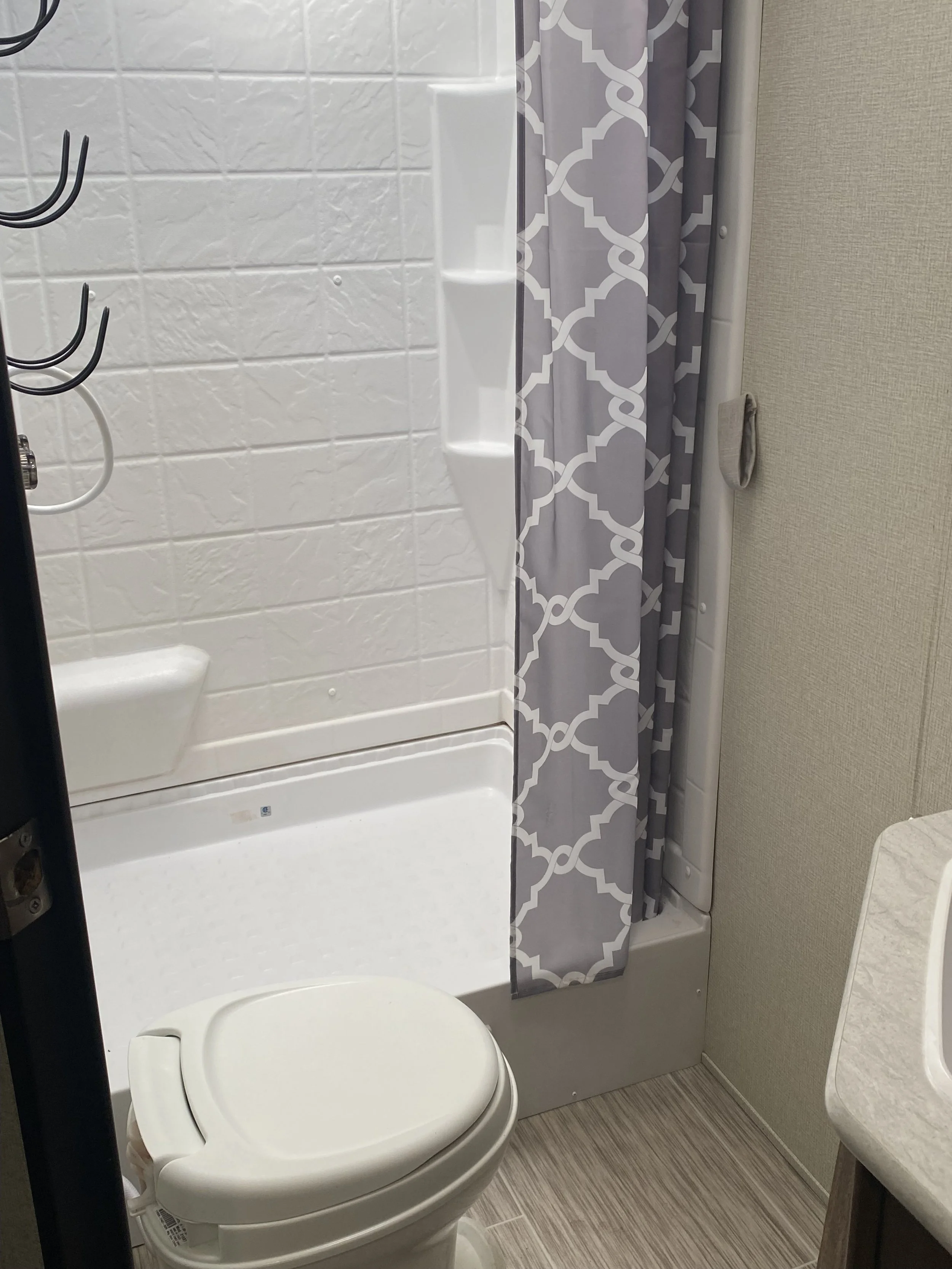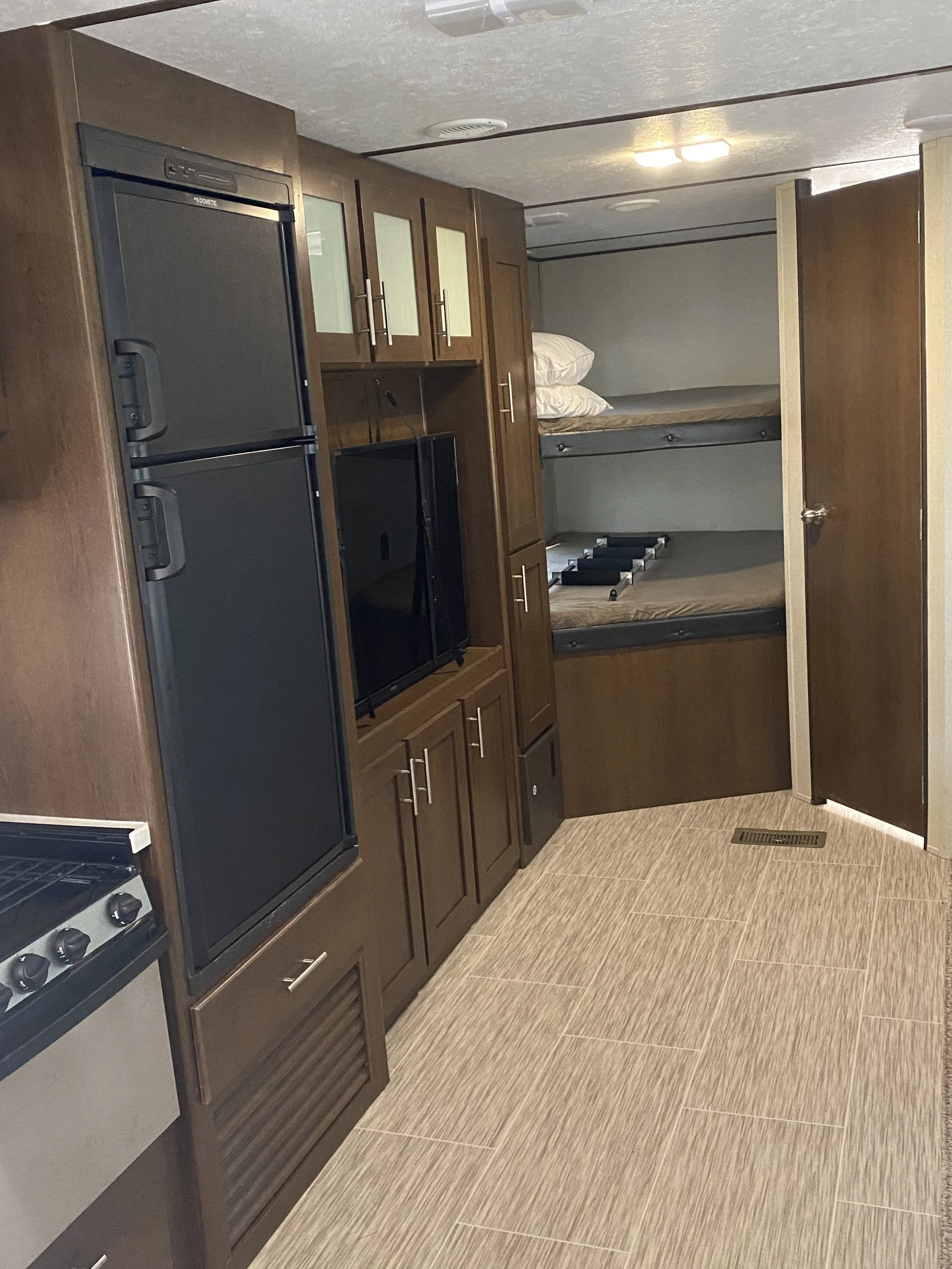 This camper is 27 feet long and sleeps 4 to 6 people comfortably. There is one queen bed upfront and two full-size bunks in the back. There is a large slide that gives more living space. The kitchen is equipped with necessities to prepare and serve meals, including a microwave, coffee maker and toaster, cookware, serving bowls, plastic plates, cups, and silverware are also included. Starter paper towels, toilet paper (camper safe), dish liquid, a small supply of Ziploc bags and aluminum foil is provided. The dinette seats four and loveseat provides additional seating. The bathroom is all enclosed in one room with a shower. A large cooler is also included. Just bring your clothes, toiletries, blankets, and food, and you’ll be set for a great camping experience.